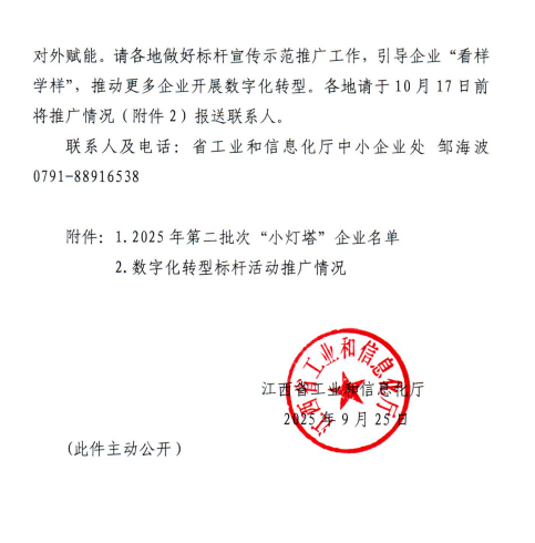2025年9月25日,江西省工业和信息化厅正式公布2025年第二批次"小灯塔"企业名单,九江中科鑫星新材料有限公司凭借其在数字化转型创新实践和显著成效,成功入选。这一殊荣不仅是对公司数字化建设成果的权威认可,更标志着企业正式成为引领区域中小企业数字化转型的示范标杆。