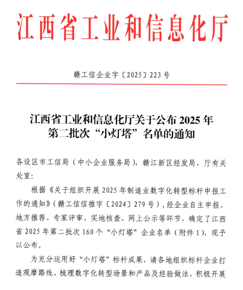2025年9月25日,江西省工业和信息化厅正式公布2025年第二批次"小灯塔"企业名单,九江中科鑫星新材料有限公司凭借其在数字化转型创新实践和显著成效,成功入选。这一殊荣不仅是对公司数字化建设成果的权威认可,更标志着企业正式成为引领区域中小企业数字化转型的示范标杆。